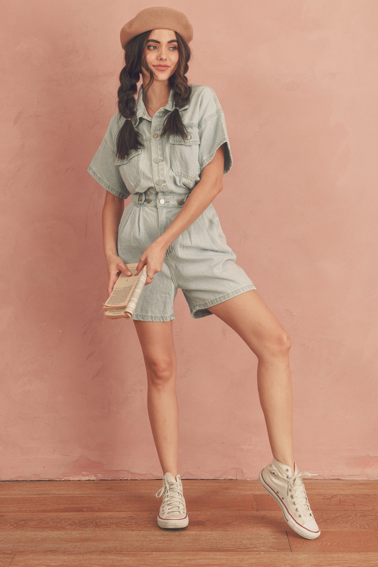 Denim romper features elastic back band. sliver hardware throughout. adjustable buttons at waist. light denim wash. and pockets throughout. Paired with our . . . and .
